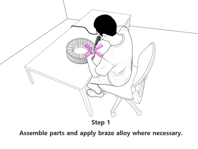 The braze alloy is first fixtured between two close-fitting components of the parent material to hold it in place. The furnace is then heated to a temperature that will melt the brazing filler metal but not the parent materials.